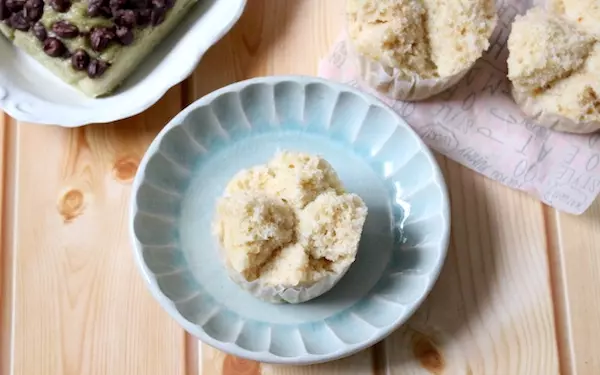 生地の液体に抹茶を加え、型に入れたらあんこをのせて蒸せば「抹茶あずき蒸しパン」のできあがり! 抹茶をココアに変えたり、生地にレーズンやナッツを混ぜ込んだり、型に生地を入れる時に真ん中にジャムを忍ばせたりと、アレンジは自由自在です。