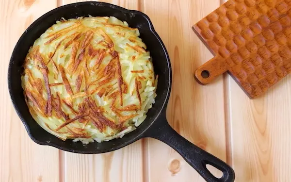 外はカリカリ、中はほっくり! フライドポテトのような味わいですが、揚げる手間いらず。今回はスキレットで作りましたが、フライパンで焼く場合はじゃがいもを真ん中に寄せて丸く整え、ホットケーキのような形を作って裏表をこんがりと焼いてくださいね。