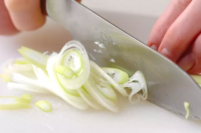 1、白ネギは斜めに薄く切る。卵は割って溶いておく。