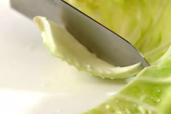 1、春キャベツは、葉と芯に切り分ける。葉の部分は食べやすい大きさにちぎり、芯は斜め薄切りにする。新玉ネギは縦薄切りにする。ソーセージは斜め半分に切る。