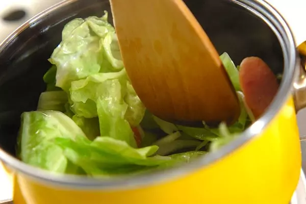 2、鍋にオリーブ油を中火で熱して、春キャベツ、新玉ネギ、ソーセージをしんなりするまで炒める。