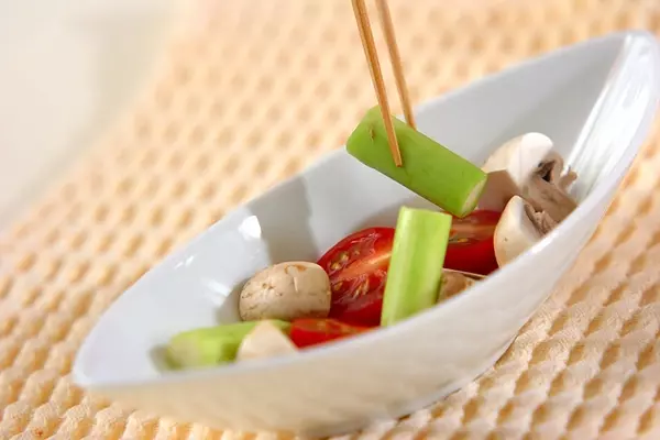 1、器にグリーンアスパラ、マッシュルーム、プチトマト、ベーコンを盛り合わせ、<ドレッシング>をかける。