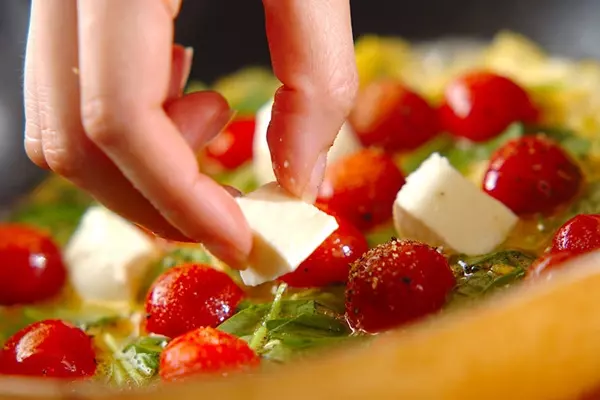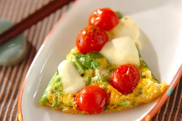 3、プチトマト、モッツァレラチーズをのせ、フライパンの蓋をして火を弱める。チーズが溶けたら、食べやすい大きさに切って器に盛る。