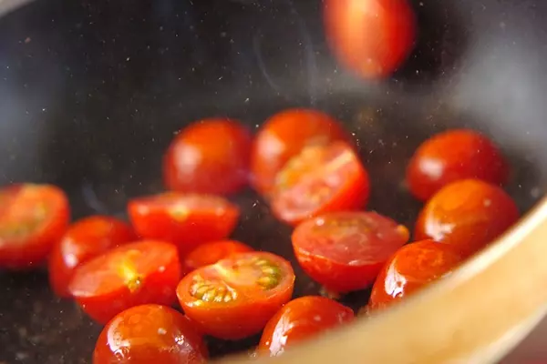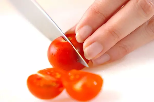 ・プチトマトはヘタを取って水洗いし、半分に切る。