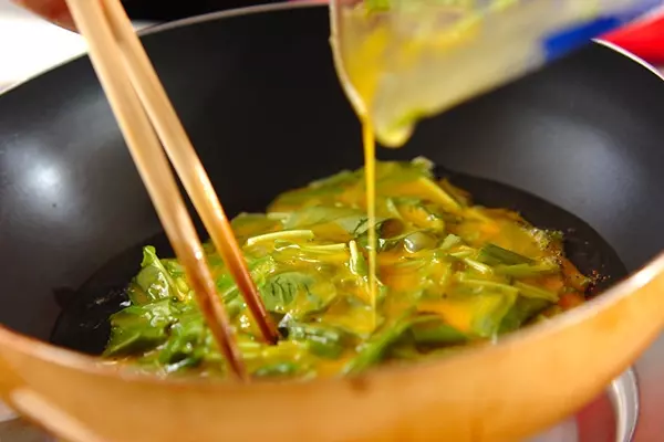 2、フライパンにサラダ油を入れて強めの中火にかけ、フライパンが温まったら一気に(1)の卵液を流し入れ、菜ばしで大きく円を描くように混ぜる。