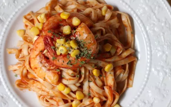 3、海老の色が変わったらみそを加え、1のきしめんととうもろこしを加える。