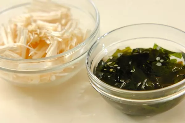 ・ワカメは水で柔らかくもどして水気を絞り、長い物はザク切りにする。