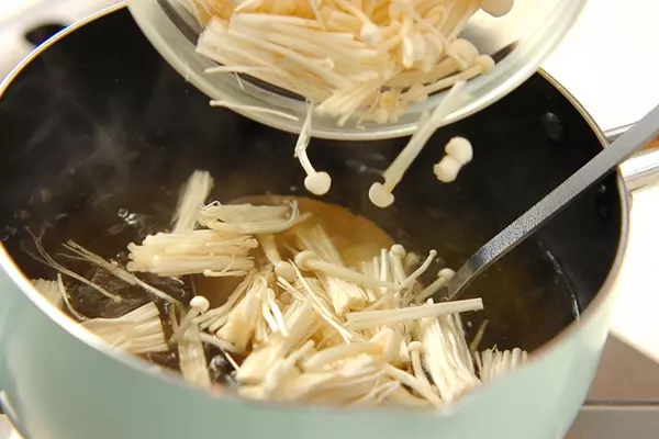 1、鍋に<スープ>の材料を入れて中火にかけ、固形チキンスープの素が煮溶けたらエノキを加える。