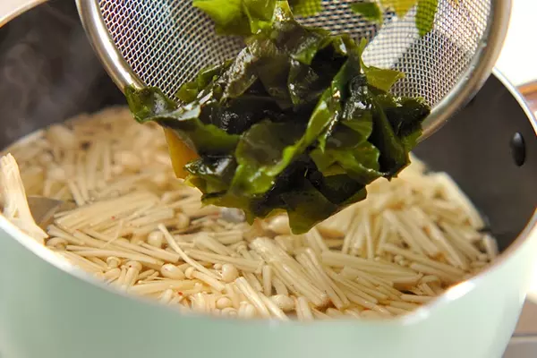 シャキシャキ食感で食べ応え十分!「エノキとワカメのスープ」