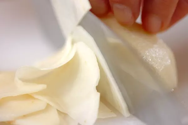 ・新ジャガイモは皮をむいて半月の薄切りにし、水に放つ。