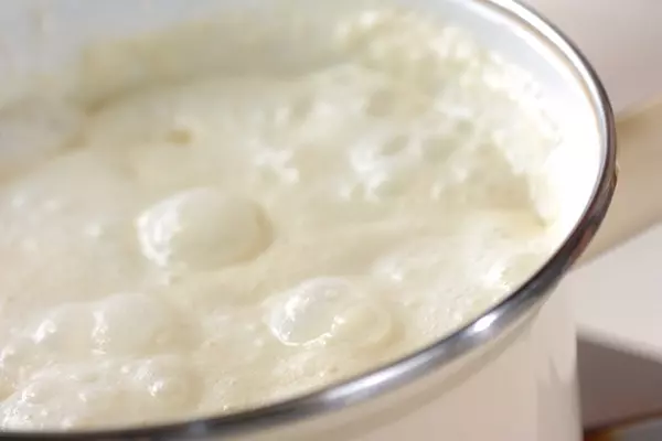 1、鍋に新ジャガイモ、玉ネギ、豆乳、水、固形チキンスープの素、塩を入れて中火にかけ、煮立ったら火を弱めて10分煮る。
