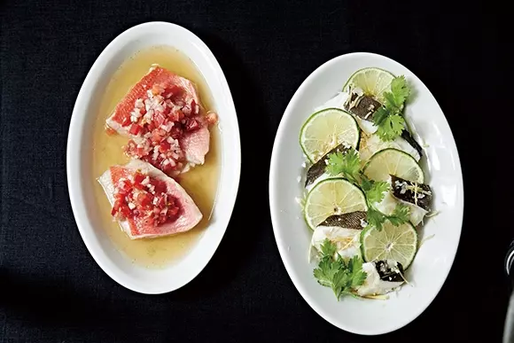 左) キンメダイの湯煮ブイヨン仕立て 右)白身魚の湯煮エスニック仕立て