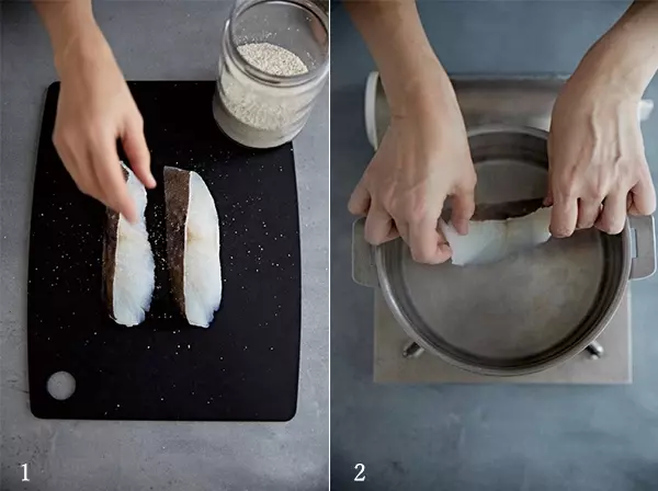 2、鍋またはフライパンで湯を沸かし、少量の酒(日本酒や白ワイン)と魚を入れる。