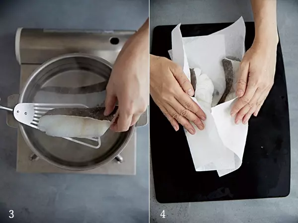 3、沸騰しない火加減で3~5分間加熱したら、魚を取り出す。