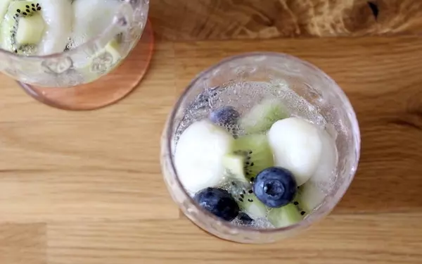 豆腐白玉だんごとフルーツをグラスに入れ、サイダーを加えれば、フルーツポンチのでき上がり!暑い日にさわやかなおやつです。