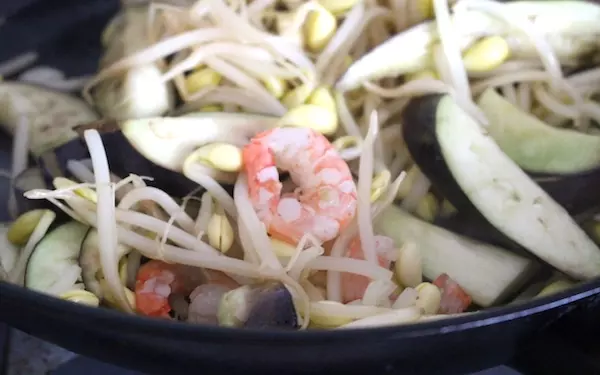 4、中火にして豆もやし、ナス、小えびを炒めて、火が通ったら米粉麺とニラを加える。