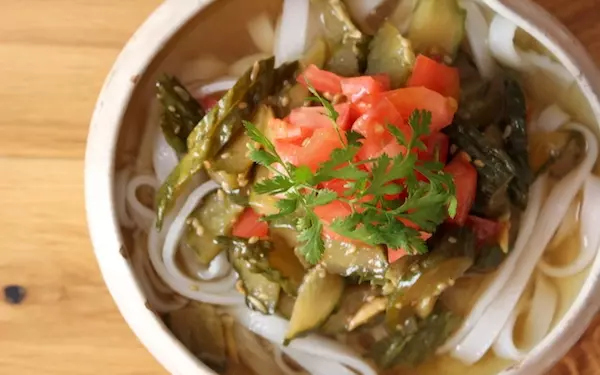 米粉麺をお湯で戻している間に、鍋に干ししいたけを入れて沸騰させ、本みりんと塩、しょうゆで調味した汁を作ります。お好みの具材をのせれば、手軽に作れる「和風フォー」のできあがり! 暑い日には汁を冷まして、冷たいフォーも楽しめます。今回は、冷たい汁にきゅうりの甘酢炒めとトマトの角切り、パクチーを加えてみました。