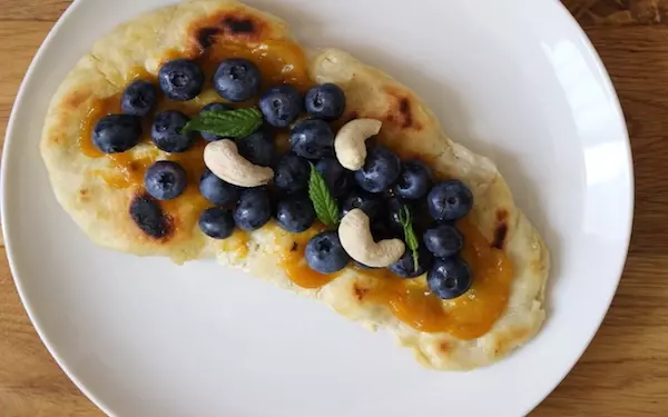 デザートピザのように、ナンの上にフルーツやジャムなどを盛りつけてみました。今回は爽やかにマーマレードジャムとブルーベリー、カシューナッツ、ミントをトッピング。デザートナンに仕立ててみました。クリームやチーズなど、お好みの素材をのせて楽しんでみてはいかがでしょうか?カレーの後のデザートにもオススメです。