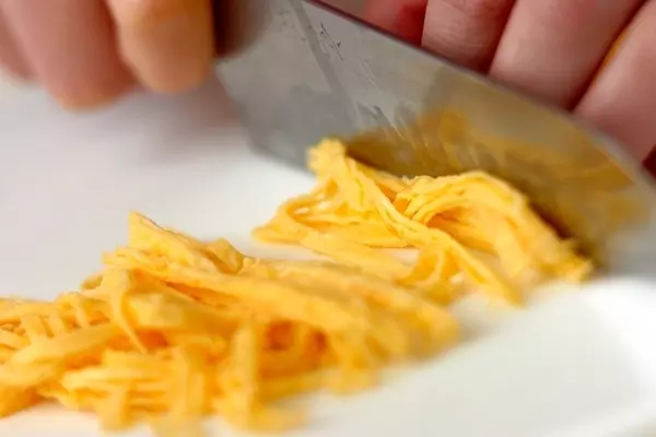 ・<錦糸卵>の卵に砂糖を加えて混ぜ合わせ、薄くサラダ油をひいて熱したフライパンに一気に流し入れ、卵液を全体に広げる。表面が乾いてきたらひっくり返す。まな板に出して冷めたら2~3等分に切り、さらに細切りにする。