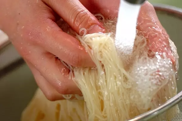 2、素麺をゆでる。鍋に湯を沸かし、素麺の束をほぐしなから入れ、時々菜ばしでまぜる。煮たったら分量外の水を加え、再び煮たったら火を止めてザルに上げる。 流水をかけて冷まし、もみ洗いしてぬめりを取る。