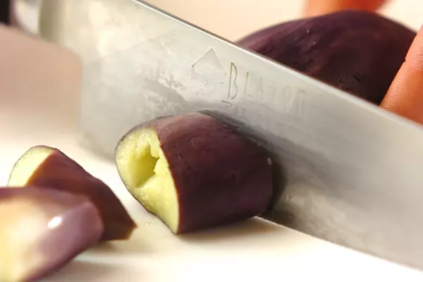 1、ナスはガクとヘタを切り落とし、楊枝で数カ所を刺して水にくぐらせ、耐熱容器に移してラップをかけ、電子レンジで5分加熱する。粗熱が取れたらひとくち大の乱切りにして塩を振る。