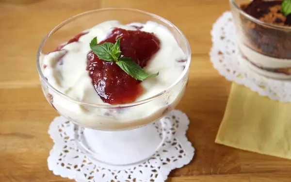 「さっぱり豆腐ティラミス」のココアをジャムやフルーツに変えると、さらにさわやかなデザートになります。今回はイチゴジャムとブルーベリーを添えてみました。フルーツの盛り合わせなどにヨーグルト代わりに添えても、その風味を楽しめますよ。ぶどうやなしなど、季節のフルーツと一緒に楽しんでみてくださいね。