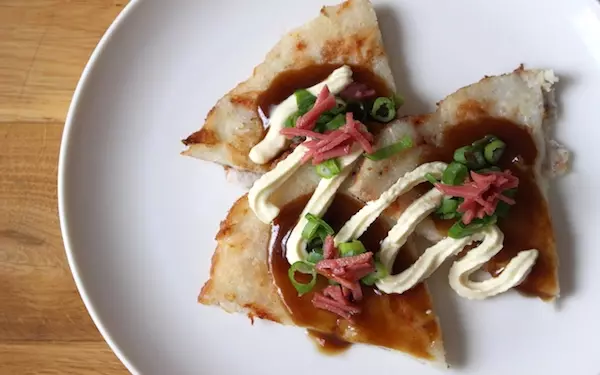 ●アレンジ例「もちもち大根もち」が仕上がったら、ソースやマヨネーズ、青のり、紅しょうがを添えてみてください。お好み焼きよりも、もっともちもちで満足感ある軽食が楽しめますよ。