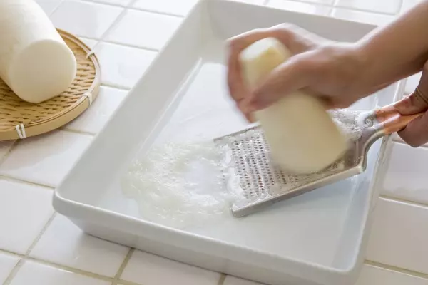 1、ボウルに大根をすりおろして入れ、米粉と塩、桜えびを加えて混ぜる。
