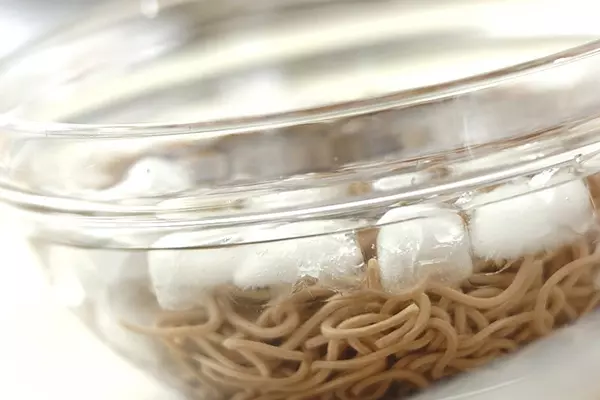 1、火を止めた熱湯にそばを入れ、菜ばしで軽く混ぜてほぐし、ザルに上げる。流水で冷やし、粗熱を取る。氷水を入れたボウルにサッとくぐらせてそばをしめ、ザルに上げてしっかり水気をきる。