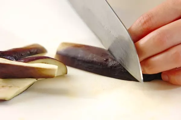 ・ナスはガクを切り落とし、縦4つに切って塩水に放つ。