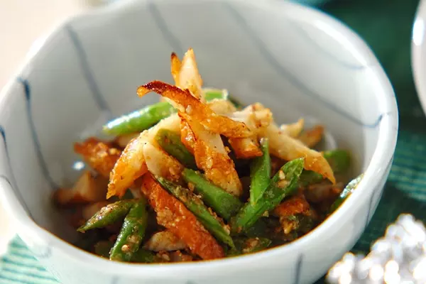 インゲンとちくわを炒めて、ゴマダレで和えた一品。食材を炒めることで、旨みと香ばしさが増して、なんともいえないおいしさです。冷めてもおいしさが損なわれにくいため、お弁当のおかずにするのもいいですね。