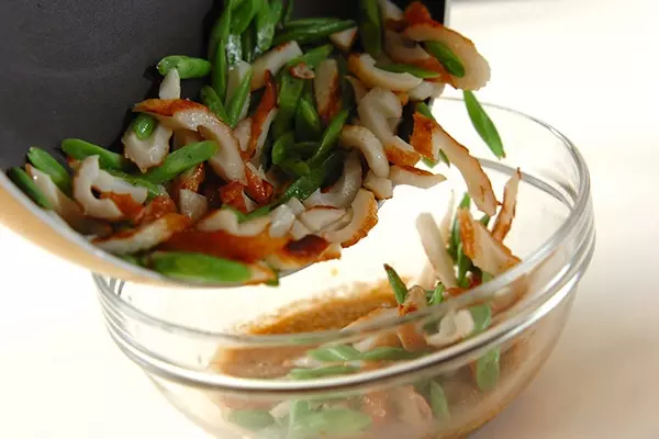 1、フライパンにサラダ油を中火で熱し、ちくわ、サヤインゲンを炒める。全体に炒められたら<ゴマダレ>のボウルに加えて和え、器に盛る。