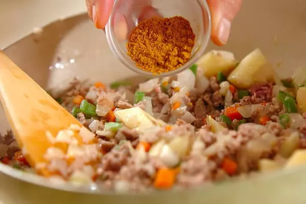 2、全体にしんなりしたら、水きりしたジャガイモ、ピーマンを加えて炒め合わせる。さらに合いびき肉を加えて炒め、色が変わったらカレー粉を加えて炒め合わせ、塩コショウをする。