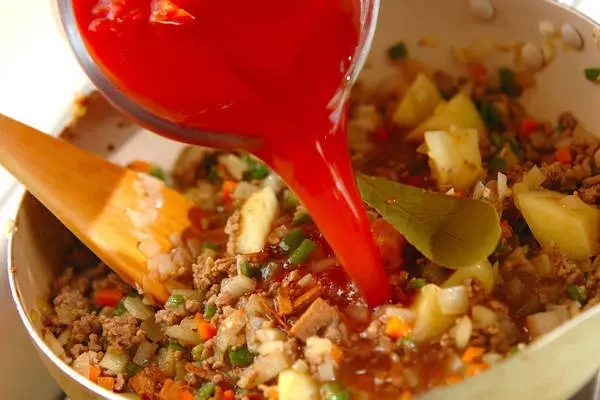 合いびき肉とみじん切りにした野菜を煮込んだカレーは、赤ワインを入れることで、仕上がりに深みが増します。