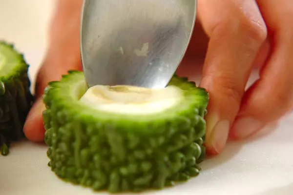 ・ゴーヤは両端を切り落として幅2cmの輪切りにし、スプーンなどで種をくり抜き、水に放ってアクを抜く。