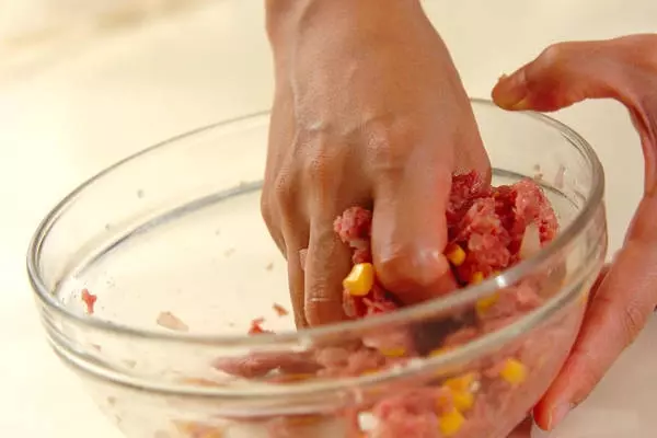 ・<タネ>の玉ネギは、分量外のサラダ油を薄くひいたフライパンでしんなりするまで中火で炒め、冷ましておく。・トウモロコシは包丁で粒を削ぎ落とし、フライパンにバターと共に入れて少し炒め、色がついたら塩コショウを振り、冷ましておく。