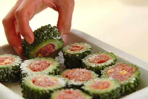 2、ゴーヤの水気を拭き取って軽く小麦粉を振り、(1)の<タネ>を詰め、さらに切り口に薄く小麦粉をからめる。