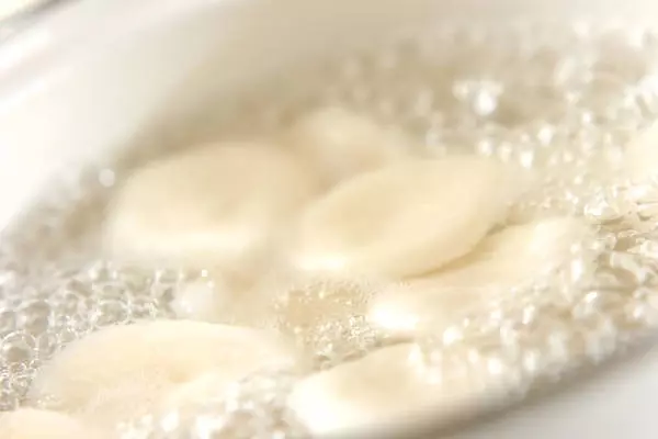 1、白玉団子を食べやすい大きさに丸めて指先で少し押しつぶし、たっぷりの熱湯に入れる。浮き上がってきたら1~2分ゆでて氷水に取り、冷たくなったらザルに上げる。