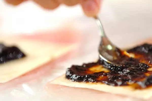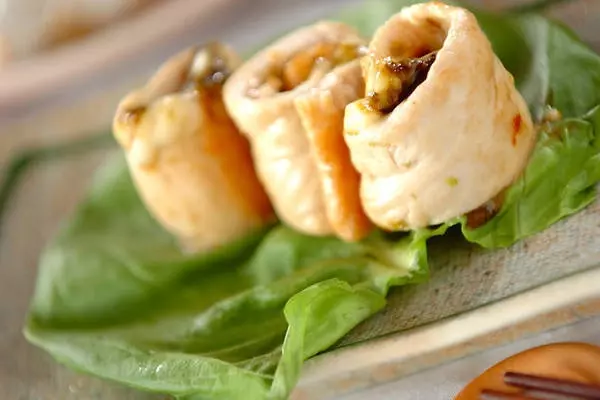 1、鶏ささ身にスライスチーズをのせ、のりの佃煮をぬる。くるくると巻き、楊子で留める。4本作る。