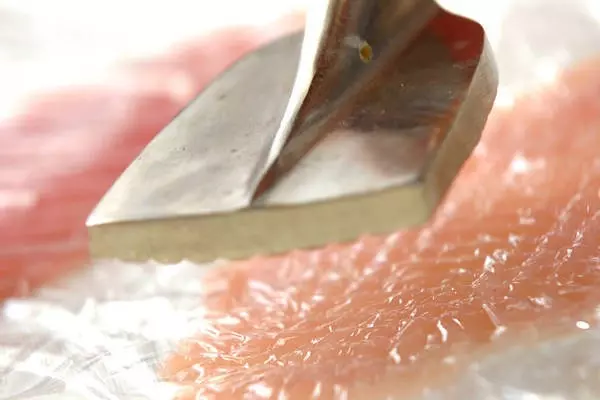 ・鶏ささ身は筋をひき、厚さを半分に切って開き、ラップにはさんで肉叩きで薄くなるまで(2倍の大きさくらいまで)叩く。