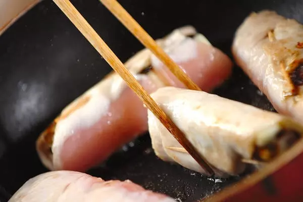 2、フライパンにサラダ油を中火で熱し、(1)を転がしながら焼き色がつくまで焼き、蓋をして2分蒸し焼きにする。楊子を外して食べやすい大きさに切り、サラダ菜をしいた器に盛る。