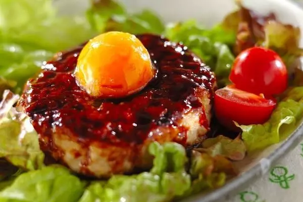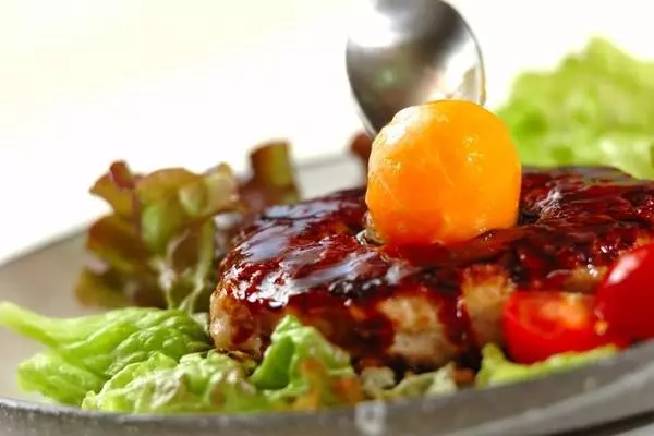 6、器にサニーレタスを広げてつくねをのせ、タレをかける。くぼみに冷凍卵の黄身をのせる。