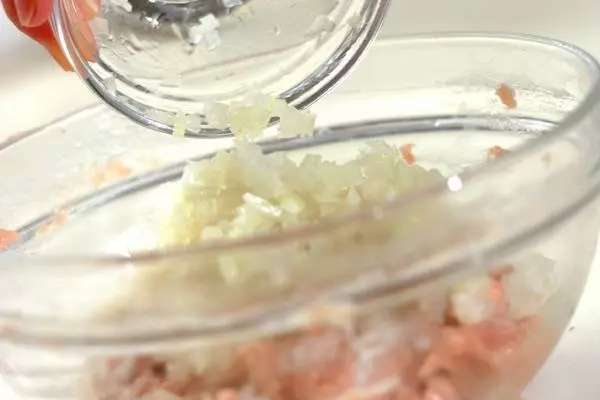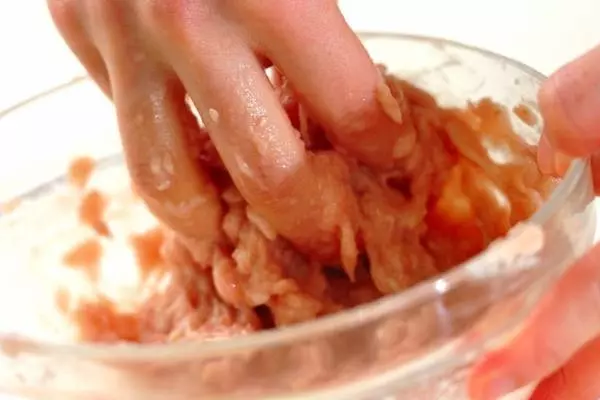 1、ボウルに鶏ひき肉と塩コショウを入れ、粘り気が出るまで手早くしっかりと混ぜる。冷凍卵の白身だけを入れ、さらに混ぜる。