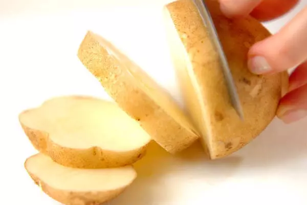 ジャガイモは皮ごときれいに水洗いし、厚さ1cmの輪切りにする。