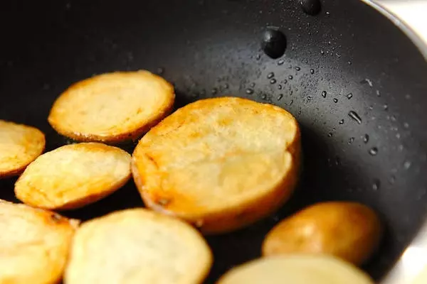 1、フライパンにオリーブ油を中火で熱し、ジャガイモを並べて両面焼き色がつくまで焼く。竹串を刺してスッと刺さったらOKです。