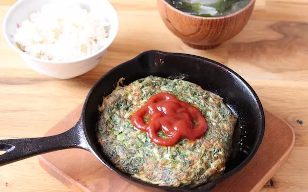 お好みで、ケチャップなどを添えて召し上がれ! 今回は子どもが苦手な青菜No.1に入りそうな春菊を使いましたが、我が家の娘もパクパク食べていました。小松菜、ほうれん草、水菜など、どんな青菜でも同じように作れます。