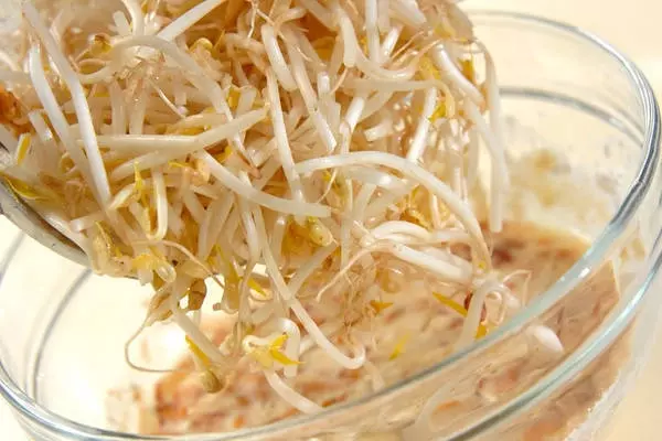 1、ボウルに卵を割り入れて、水を加え混ぜる。小麦粉と塩を加えてなめらかになるまでよく混ぜる。モヤシ、干し桜エビ、かつお節を加える。
