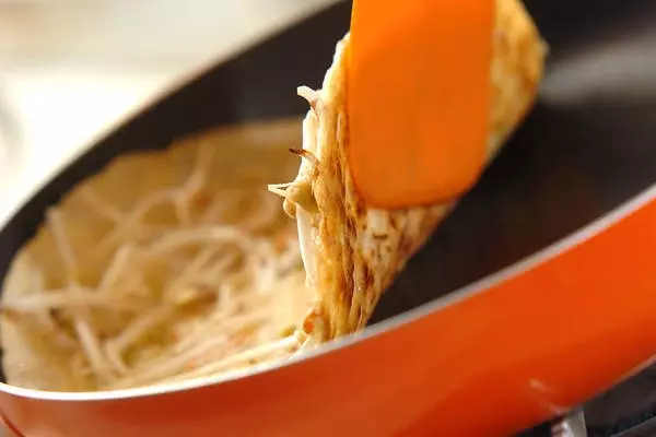 2、フライパンにゴマ油の半量を入れて強火にかけ、(1)の半量を流し入れる。フライパンに広げ、カリッとした焼き目がつくまで焼く。