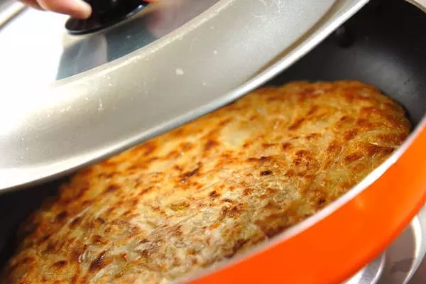 3、裏返して蓋をし、弱火~中火で中まで火を通す。半量も同様にして焼く。