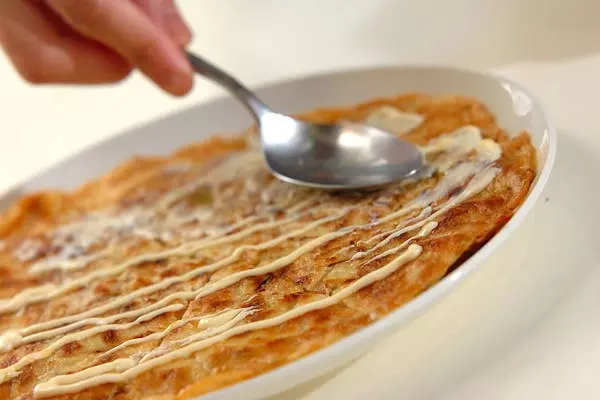 4、器に盛り、マヨネーズをぬり、<タレ>を添える。